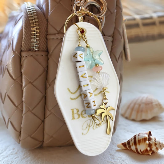 Personalized Name Beach Motel Bag chain with Seashell, Palm Tree & Retro Charm