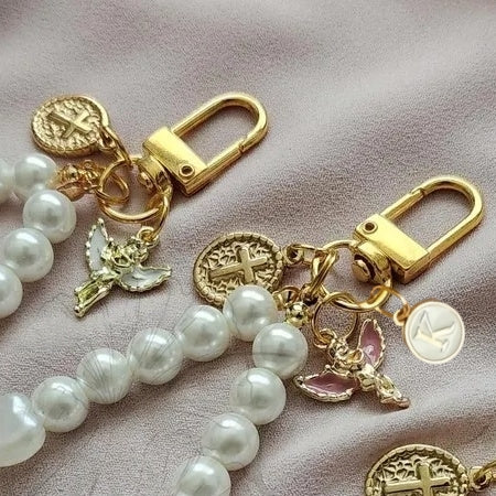Pearl Wristlet Keychain – Faith Charm Accessory with Custom Initial