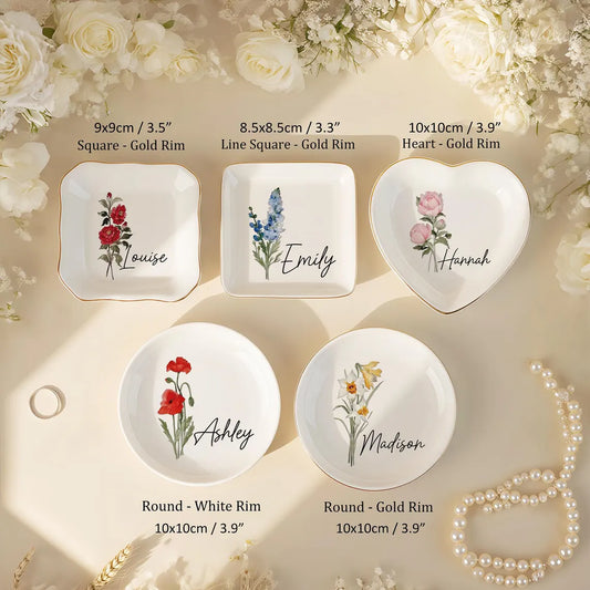 Personalised Birth Flower Trinket Dish – Custom Name Ring Dish Gift