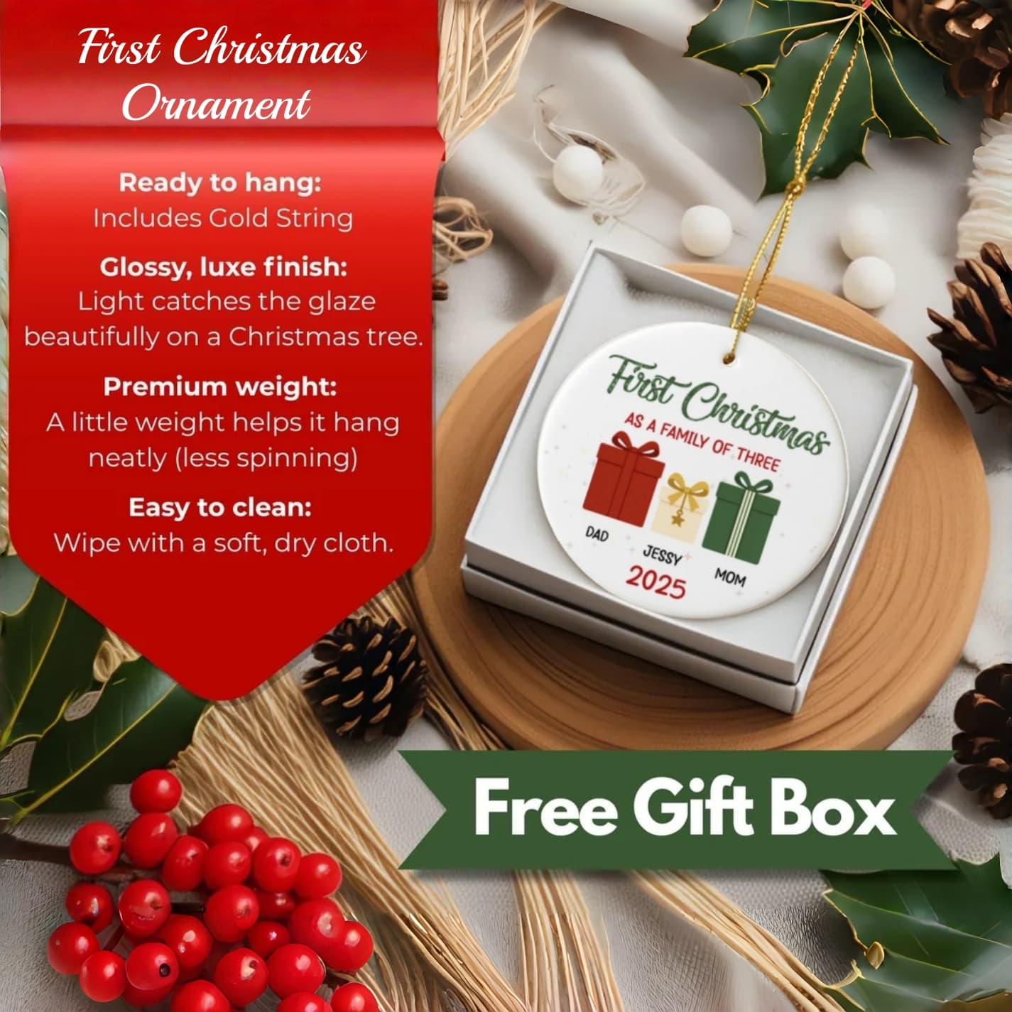 Celebrate your most meaningful holiday moment with this Personalized Christmas Ornament, perfect for your First Christmas as a Family of 3 or as a heartfelt keepsake for loved ones.