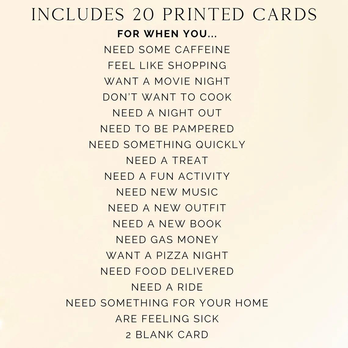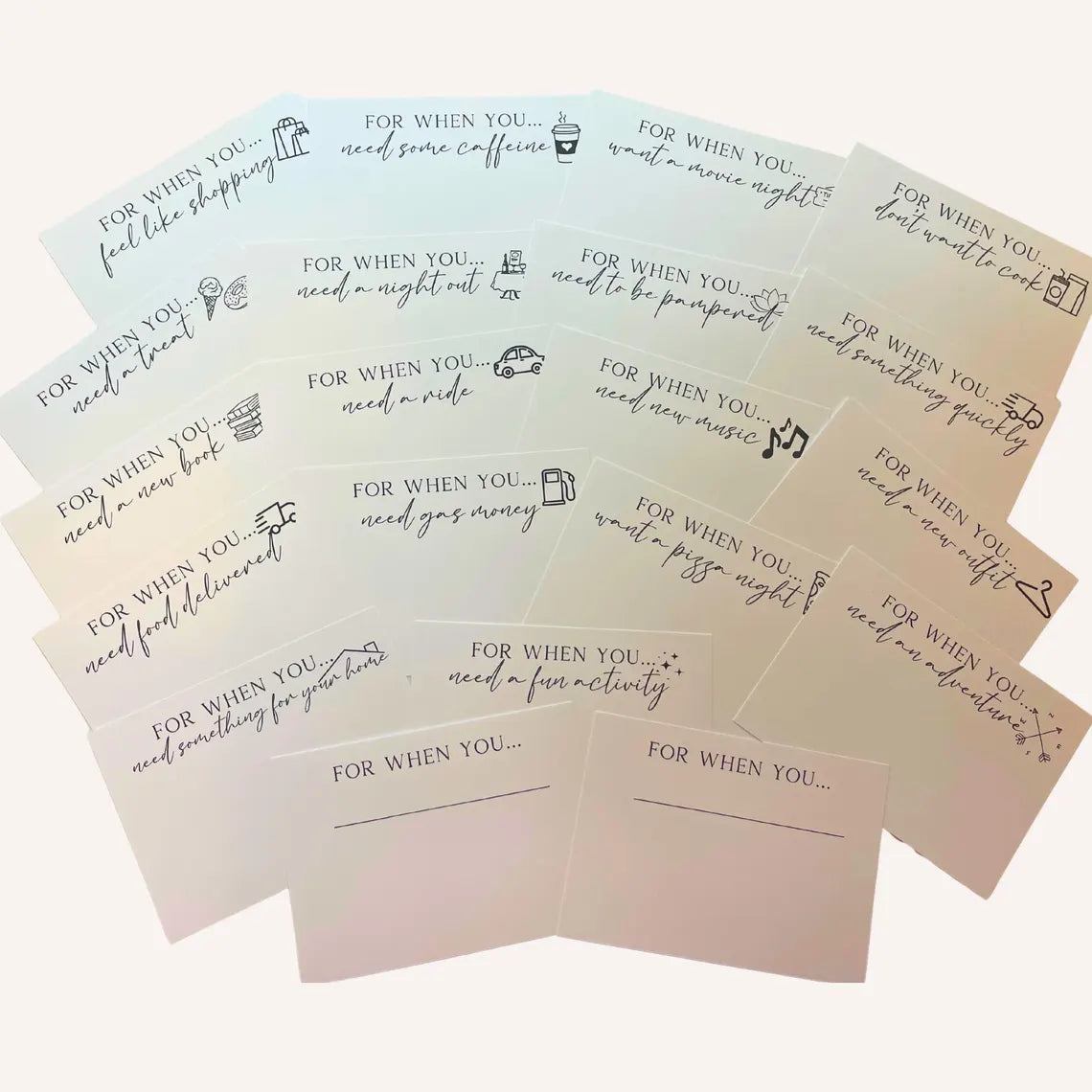🃏 20 Gift Card Holder Cards – Each card features a playful or heartfelt prompt, ready to hold gift cards or money. Includes 2 blank cards to write your own message.
