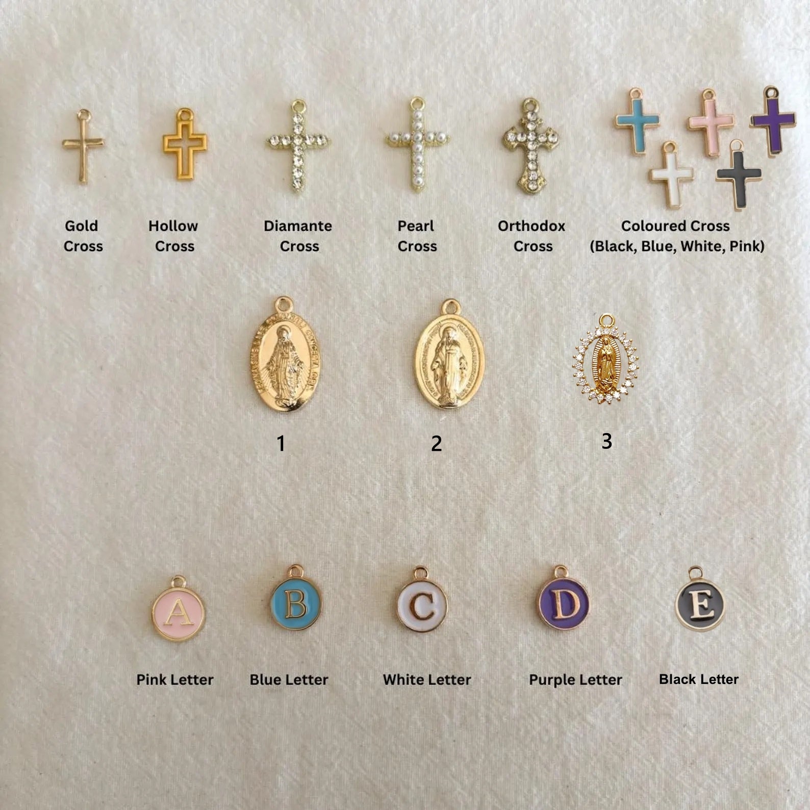 📿 Personalized Charms – Add initials, cross styles, or a saint medal of your choice