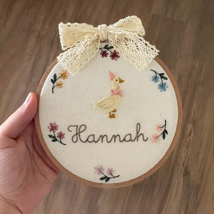Our personalized embroidered baby name plaque features a sweet nursery rhyme goose surrounded by a minimalist floral wreath, carefully stitched onto soft linen fabric.